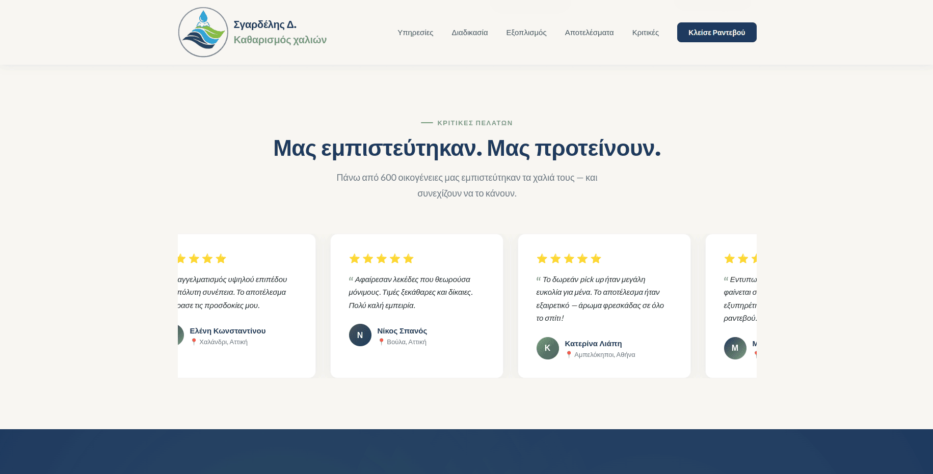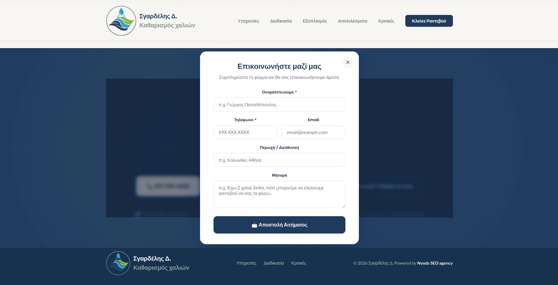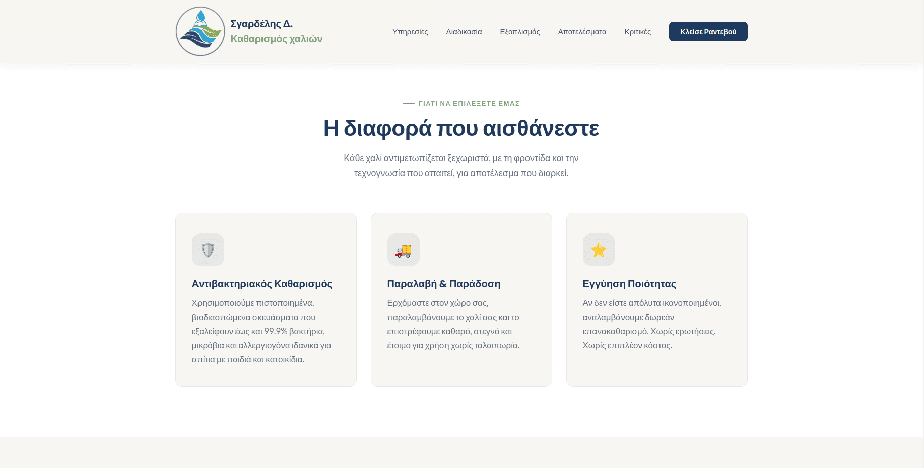 Custom website υπηρεσίας καθαρισμού χαλιών με έμφαση στο conversion, την ταχύτητα και την εμπιστοσύνη. Κατασκευή σε HTML, CSS & JavaScript με 100/100 PageSpeed performance.